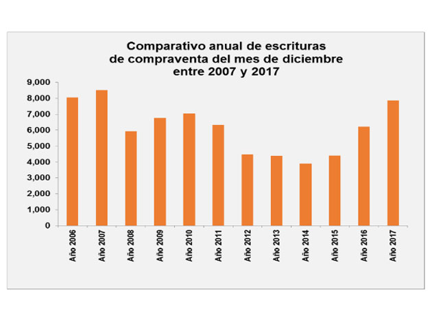 De acuerdo al Colegio de Escribanos porteño, durante diciembre el total de las escrituras de compraventa de inmuebles registró un crecimiento de 26,4% respecto del mismo mes del año anterior, para sumar 7.850 registros, mientras que el monto total de las transacciones realizadas se elevó 57,6%, con $20.022 millones. Se trató del mejor diciembre en una década para el mercado inmobiliario porteño, apenas debajo de las 8.381 escrituras de diciembre de 2007.