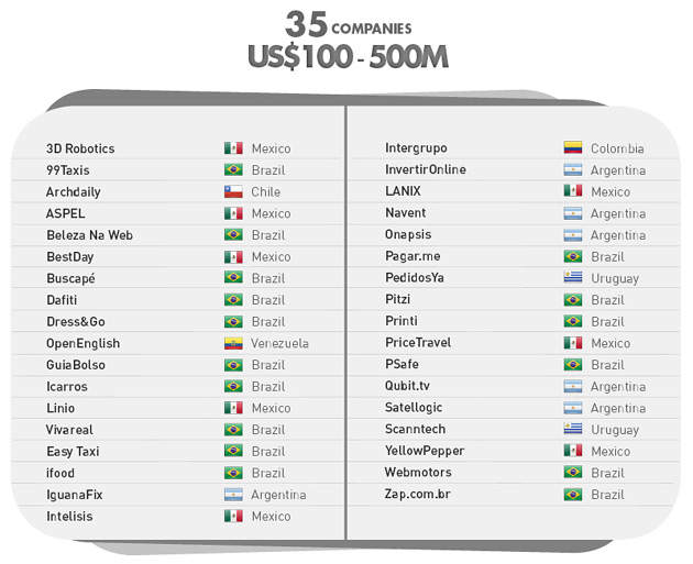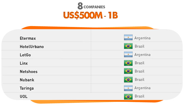 Los unicornios suman un valor colectivo de más de u$s23.000 millones y representan la mayor parte del valor del ecosistema (61%). La mayoría de ellos se centran en el espacio de Internet y nacieron antes o poco después de la burbuja de Internet 2001 (excepto OLX, Softtek y Totvs), mostrando cómo las empresas digitales pueden crear un valor gigantesco en un período de tiempo relativamente corto.