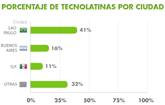La mayoría de las Tecnolatinas se encuentran en las megaciudades más grandes de la región: San Pablo (51), Buenos Aires (20) y Ciudad de México (13), que representan el 68% de estas compañías y el 87% de la creación de valor del ecosistema, destacando el valor de un gran y diverso grupo de talentos y éxitos tempranos.