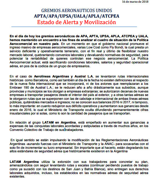 "La política aerocomercial actual está sacrificando condiciones laborales, salarios y seguridad operacional aérea, en pos de la codicia de un grupo de empresarios", expresaron los gremios en el documento, para luego alegar que el Gobierno "promueve el ingreso masivo de empresas aerocomerciales, varias low cost como FlyBondi, la cual presta un servicio deficiente y operativamente temerario, con el fin real y último de flexibilizar nuestro mercado laboral, quebrantando convenios laborales y devaluando normativas de seguridad, para potenciar la rentabilidad de quienes controlan ese negocio aerocomercial".