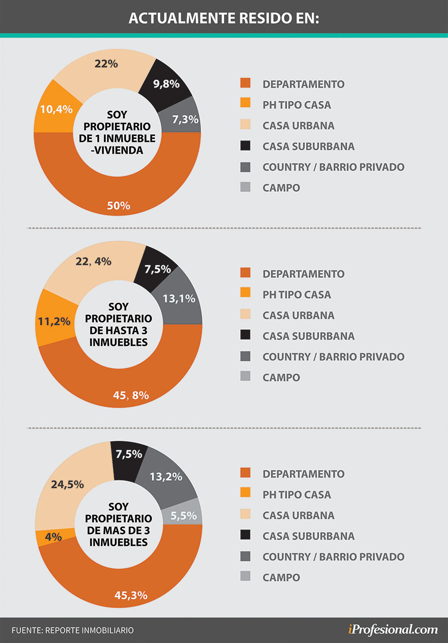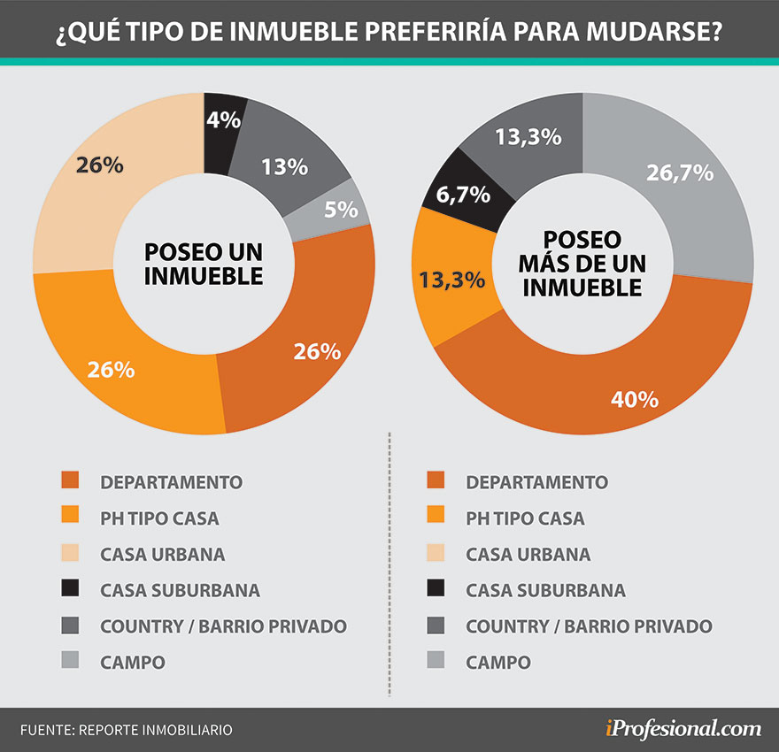 A quienes piensan en mudarse, además se les consultó a qué tipo de propiedad cambiarían su residencia. En el caso de los unipropietarios hay un empate técnico entre departamentos, PH tipo casa y casa urbana, mientras que los multipropietarios prefieren primero departamentos, seguido por el campo. Luego comparten el tercer puesto Country/Barrio Privado o PH Tipo Casa.