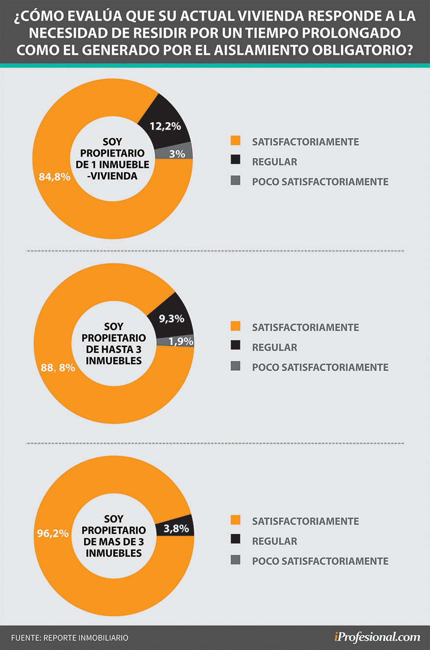 Cuando a los distintos tipos de propietarios se les preguntó cómo evalúa que su actual vivienda responde a la necesidad de residir por un tiempo prolongado, como el generado por el aislamiento obligatorio, la gran mayoría respondió que "satisfactoriamente"; siendo levemente superior el nivel de satisfacción a mayor cantidad de tenencia de inmuebles.