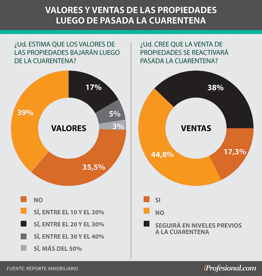 Con respecto a la percepción de los encuestados sobre cómo pueda afectar la cuarentena al sector inmobiliario, la mayoría (38,9%) cree que los precios bajarán entre un 10% y un 20%, mientras que un 35,5% estima que los valores no bajarán.
