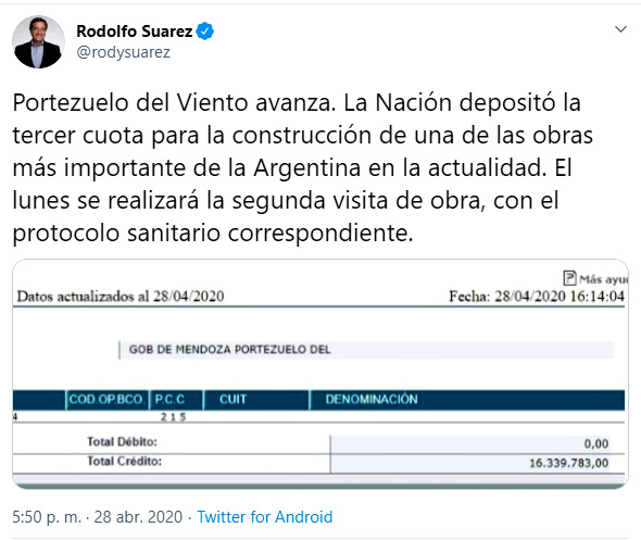 Sin reparar en este detalle, Suárez expuso en detalle el envío de los millones que transfirió el Estado nacional a mediados de la semana pasada. Y lanzó un "avanza", siempre en Twitter, para referirse a un proyecto multimillonario que en tiempos de Mauricio Macri al frente del Ejecutivo encendió críticas del mismo Fondo Monetario Internacional (FMI) a partir de su financiamiento con Letras del Tesoro en dólares: Portezuelo del Viento.