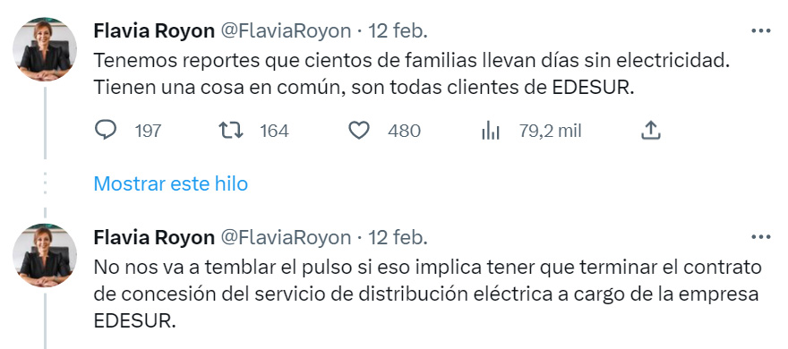 La secretaria de Energía, Flavia Royon, había señalado en su cuenta de Twitter: "No nos va a temblar el pulso si eso implica tener que terminar el contrato de concesión del servicio de distribución eléctrica a cargo de la empresa Edesur".