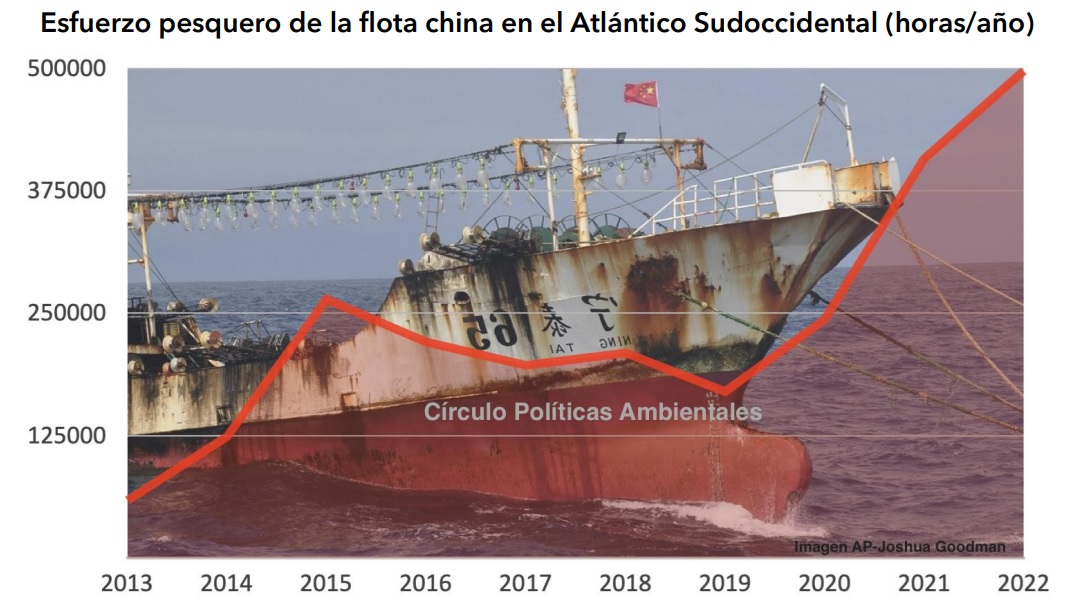 "Según el análisis realizado, el esfuerzo pesquero aparente en 2013 fue de 59.204 horas, alcanzando las 469.912 horas en 2022", añade, para enseguida destacar que "el número de embarcaciones que llegan desde otras latitudes -principalmente de China- a pescar en esta zona casi se quintuplicó en la última década".