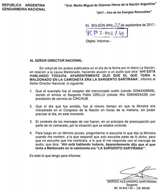 Horas más tarde, el propio sargento Sergio Sartirana envió una carta al director general de la fuerza para explicar que el audio peritado de su teléfono en el que se afirmaba "tenía a Maldonado" en su camioneta fue "en tono jocoso".