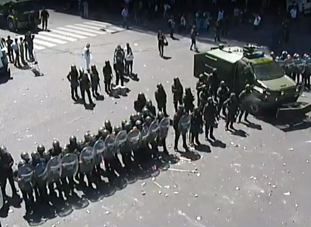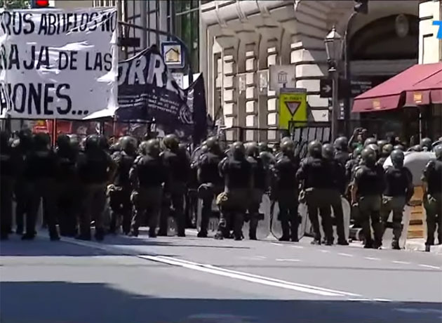Ante ello, efectivos de la Gendarmerí­a arrojaron gases lacrimógenos y utilizaron los carros hidrantes para hacer retroceder a los manifestantes, quienes se replegaron algunos metros sobre la Plaza del Congreso.