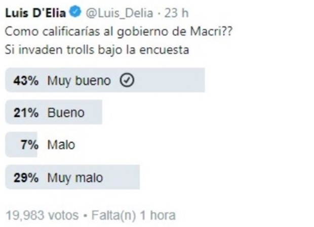 "¿Cómo calificarías al gobierno de Macri"? fue la pregunta que propusó D'Elía el sábado. Sus seguidores tenían tiempo hasta las 18 del domingo para responder. Pero cuando la tendencia a favor de Macri era demasiado amplia, el propio piquetero decidió levantarla, según Clarín.