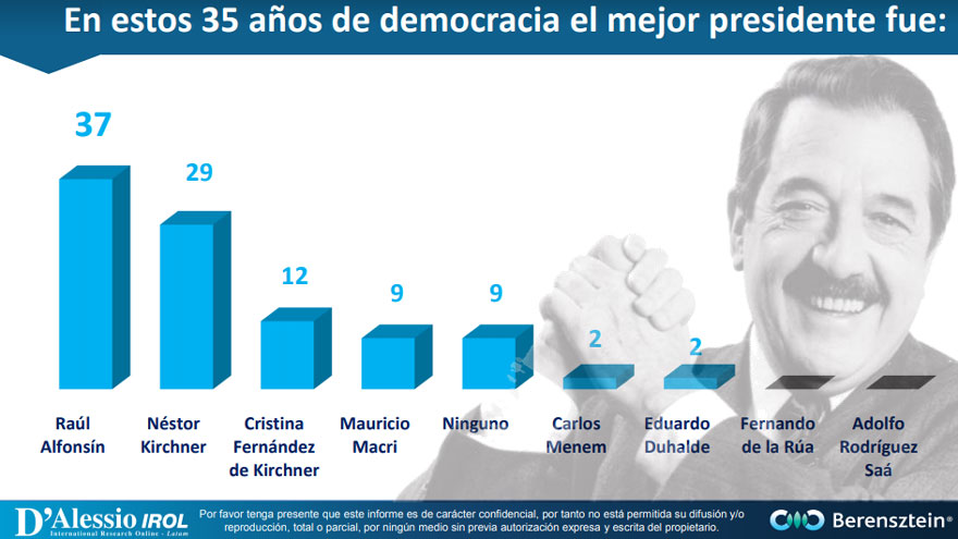 En el ranking de los mejores mandatarios desde la vuelta de la vida democrática, Raúl Alfonsín lidera la lista, con un 37%. Lo sigue Néstor Kirchner, con el 29%. Tercero y cuarto aparecen Cristina y Macri, pero ya con porcentajes bajos (12% y 9%). De la Rúa tiene 0%.