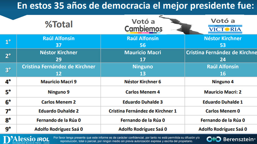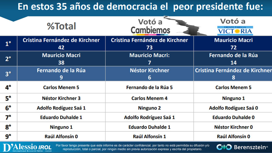 En el trabajo se consultó por el mejor presidente desde el regreso de la democracia al peor presidente. Y también se analizó cómo era esa respuesta entre votantes de Cambiemos y del Frente para la Victoria.