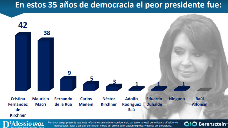 En la encuesta “negativa” ganó Cristina Kirchner con un 42%. Pero ahí nomás apareció Mauricio Mauricio Macri con un 38%. Fernando de la Rúa, que abandonó la Casa Rosada en helicóptero en medio de la crisis del 2001, figura tercero y cosechó apenas un 9%.