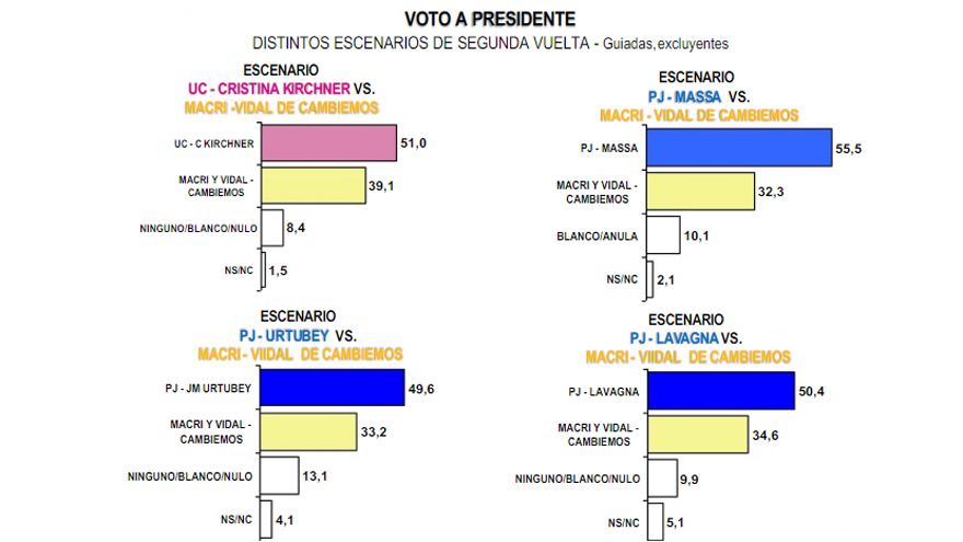 En cuanto al análisis de los escenarios electorales en donde los candidatos fueran Macri y Cristina, Massa, Urtubey o Lavagna encontramos -en continuidad con la tendencia de los últimos meses- la ex presidenta se impondría sobre Macri. Mientras los dirigentes no kirchneristas se ubicarían en tercer lugar Massa, Urtubey y Lavagna. De estos el que mayor intención de voto registra es Massa.