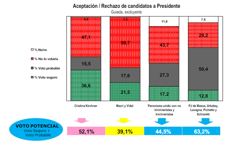 El rechazo a Cambiemos, según el trabajo, es del 59,7% mientras que el 39,1% se manifestó a favor de votar al oficialismo en los comicios de octubre. En tanto, el 47,1% aseguraron que no votarían a la exmandataria, mientras que el 52,1% sí lo haría.
