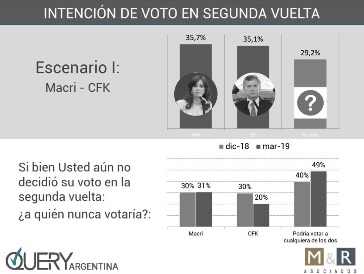 En segunda vuelta -siempre en el mismo escenario electoral- Cristina se impone con el 35,7% a Macri que alcanzaría los 35,1%.