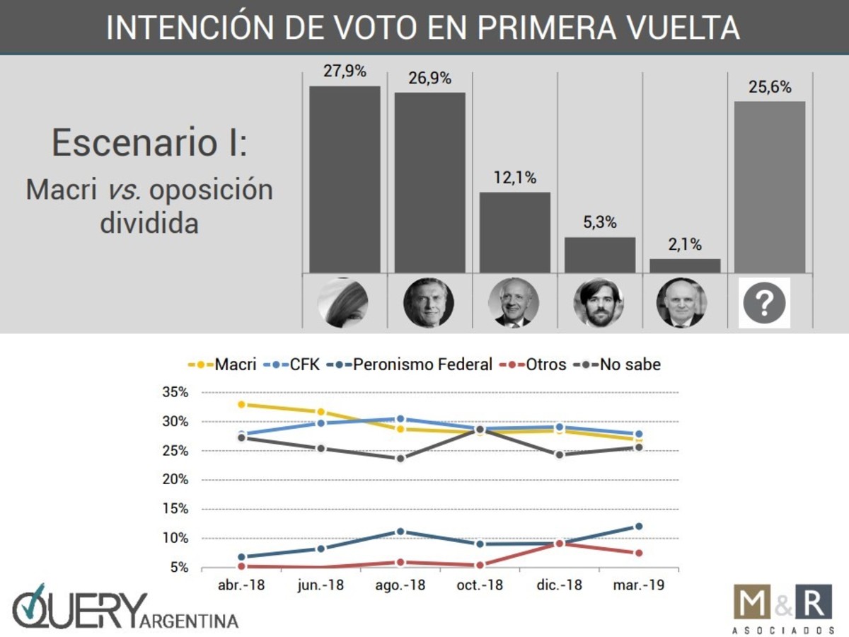 En el primero Macri se enfrenta una oposición dividida. En ese escenario Cristina Kirchner se impone (27,9%) al actual presidente (26,9%). Lavagna le sigue con el 12,1%.