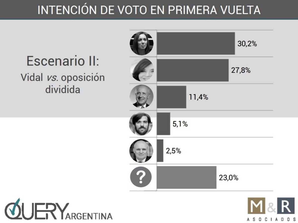 En un segundo escenario Query analiza una de las variantes que, por ahora, niegan el gobierno nacional y la propia gobernadora bonaerense María Eugenia Vidal: que la mandataria provincial sea la candidata de Cambiemos a suceder a Macri en vez de que él busque su reelección.