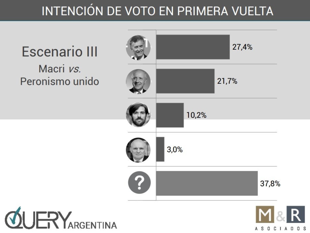 En un tercer escenario en el que Macri se enfrente a un peronismo unido que lleva como candidato a Lavagna. El Presidente lograría un 27,4% y el ex ministro de Economía un 21,7%. En segunda vuelta Macri lograría un 34,4% perdiendo la elección con Lavagna que alcanzaría el 35,2%. El nivel de indecisos es del 30%.