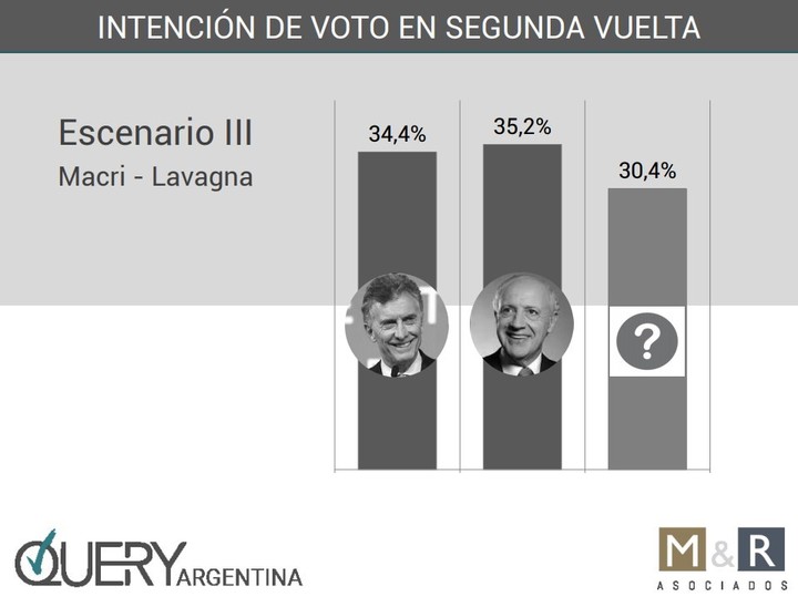 El balotaje repite la lógica de los escenarios anteriores: dividido en tres tercios, Lavagna le saca 8 décimas a Macri (35,2% vs. 34,4%), con 30,4% de indecisos.