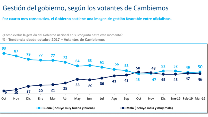 Un dato positivo para Cambiemos es que comienza a revertir la mirada negativa sobre su gestión que tenían quienes habían votado por el oficialismo en las últimas elecciones. En octubre del año pasado, la mitad de quienes apoyaron a Macri en los comicios tenían una imagen mala de las políticas del Gobierno, mientras el 48 por ciento mantenía la confianza. En marzo, la consultora registró datos exactamente inversos.
