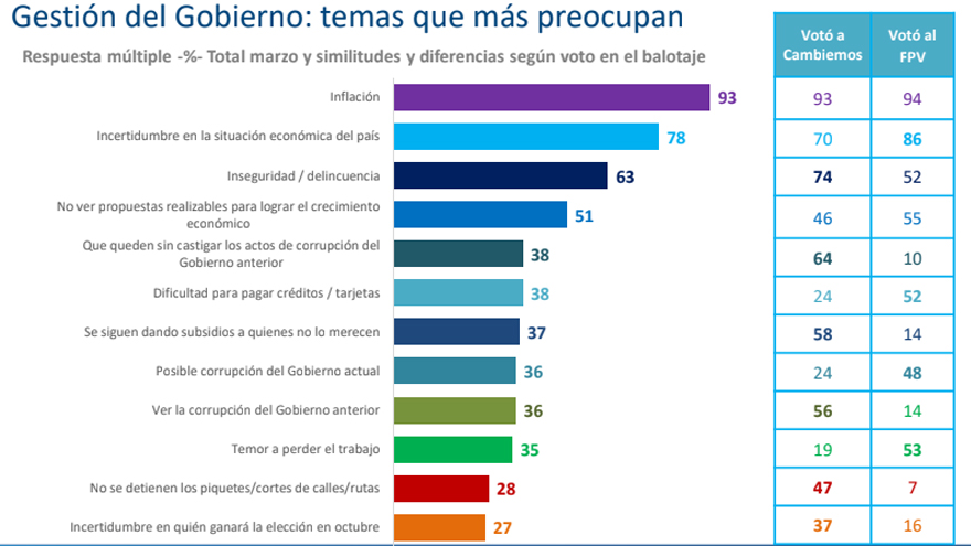 El estudio, que relevó durante el mes pasado la opinión de 1180 adultos en todo el país, destacó que mientras un 93% de los encuestados considera a la inflación como la principal preocupación social, un 78% señala a la incertidumbre sobre la situación económica, un 63% apunta a la inseguridad y un 51% enciende la luz de alerta sobre la falta de "propuestas realizables para lograr el crecimiento económico".