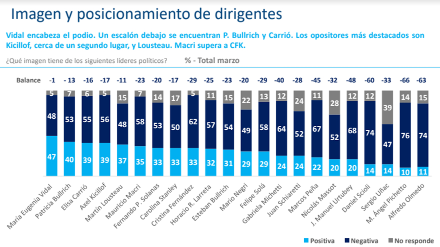 Quien sigue destacándose en cuanto a imagen es la gobernadora bonaerense, María Eugenia Vidal, quien tiene imagen positiva (47%), que es muy similar a la negativa (48%).