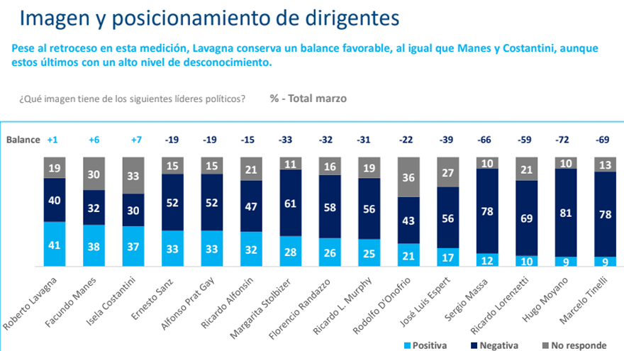 Y le sigue el ex ministro de Economía Roberto Lavagna quien desde que irrumpió en la escena pública como candidato presidencial su figura ha descendido en la consideración nueve puntos. Ahora tiene 41% de imagen positiva y 40% de negativa. De todos modos, tiene a su favor que cuenta con un 19% de desconocimiento en el que puede trabajar para tratar de mejorar.
