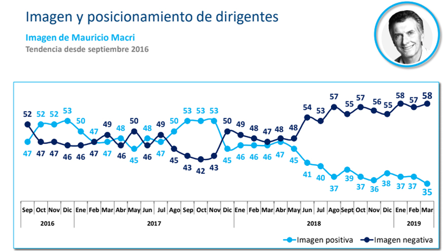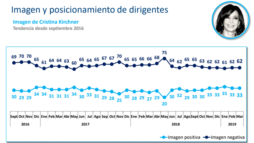 En este contexto, la imagen positiva del presidente Macri continúa cayendo y es de solo 35 puntos (58% de negativa), mientras que su antecesora, Cristina Kirchner, se mantiene en 33% (62% negativa).