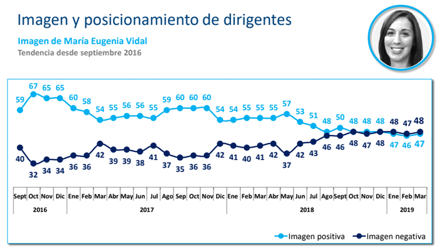 Mientras la imagen positiva del presidente Mauricio Macri continúa en baja  y la de su principal rival electoral, Cristina Kirchner, tampoco repunta, aparece la figura de María Eugenia Vidal al tope de las preferencias de la gente.