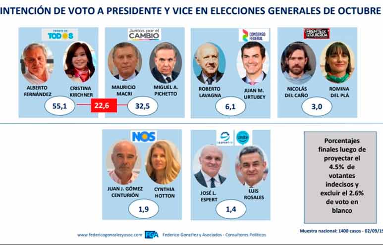 Asimismo, el trabajo de Federico González indagó sobre la intención de voto a presidente y vice de cara a las elecciones generales de octubre. Con la proyección de 4,5 % de votantes indecisos y 2,6% de votos en blanco, la fórmula Alberto Fernández-Cristina Kirchner alcanzaría el 55,1% y ampliaría a 22,6 puntos su diferencia con la fórmula Mauricio Macri y Miguel Angel Pichetto.