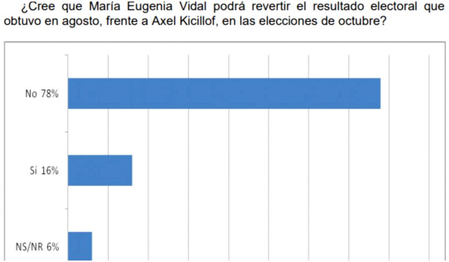Una encuesta del Centro de Opinión Pública de la Universidad de Belgrano (COPUB) indica que el 78% de los consultados cree que Vidal no podrá revertir el resultado que se registró en las PASO, en las que resultó ganador el ex ministro de Economía Axel Kicillof.