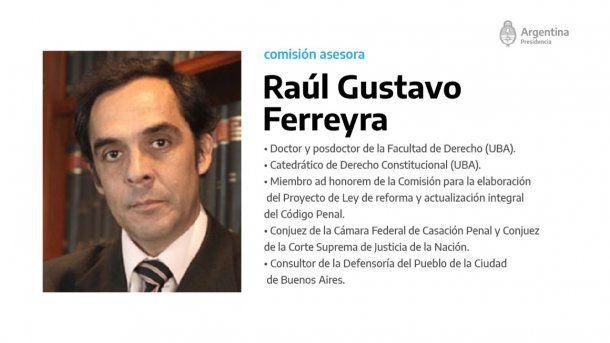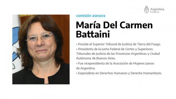 También es integrado por María del Carmen Battaini, titular del Poder Judicial de Tierra del Fuego y especialista en derechos humanos; el catedrático Raúl Gustavo Ferreyra y Carlos Arslanian, exintegrante de la Cámara Nacional de Apelaciones que en 1985 juzgó a las Juntas Militares de la última dictadura.