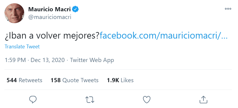 A raíz del cierre del aeropuerto de El Palomar, el expresidente Mauricio Macri publicó una carta en su Facebook con fuertes reclamos contra el gobierno de Alberto Fernández. Allí se queja de la decisión de dejar de operar vuelos comerciales a la que califica como como una "clausura ideológica". "Si teníamos alguna esperanza de que podían haber vuelto mejores, ahora ya no la tenemos", escribió haciendo alusión al slogan del oficialismo del Frente de Todos por el triunfo en las últimas elecciones.
