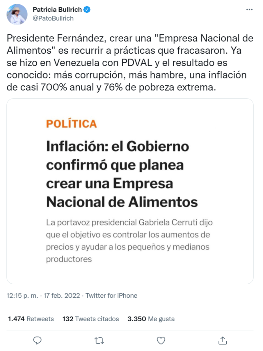 "Presidente Fernández, crear una "Empresa Nacional de Alimentos" es recurrir a prácticas que fracasaron. Ya se hizo en Venezuela con PDVAL y el resultado es conocido: más corrupción, más hambre, una inflación de casi 700% anual y 76% de pobreza extrema", cuestionó Bullrich.