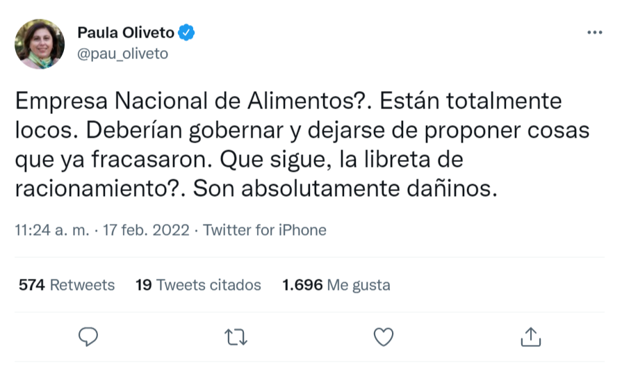 "¿Empresa Nacional de Alimentos?. Están totalmente locos. Deberían gobernar y dejarse de proponer cosas que ya fracasaron. Que sigue, la libreta de racionamiento? Son absolutamente dañinos", lanzó la legisladora de la Coalición Cívica Paula Oliveto.