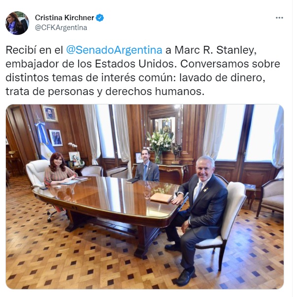 Fernández de Kirchner dio a conocer la información en su cuenta de Twitter. "Recibí en el Senado a Marc R. Stanley, embajador de los Estados Unidos. Conversamos sobre distintos temas de interés común: lavado de dinero, trata de personas y derechos humanos", informó la expresidenta.