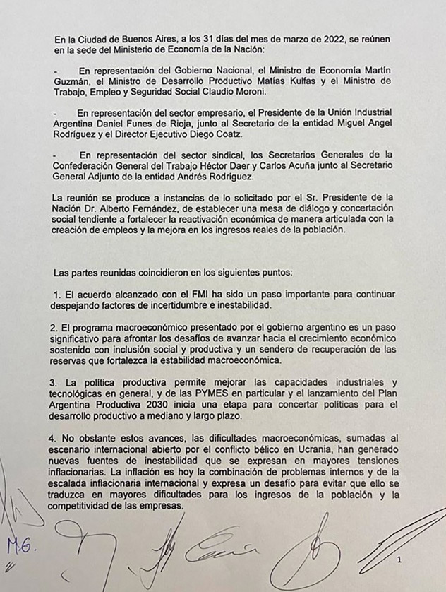 El anuncio se conoció tras la reunión de la que participaron los ministros de Economía, Trabajo y Desarrollo Productivo, Martín Guzmán, Claudio Moroni y Matías Kulfas. En un documento emitido tras el encuentro, los firmantes respaldaron el acuerdo con el FMI. Además, se estableció que habrá una nueva reunión de trabajo la próxima semana.