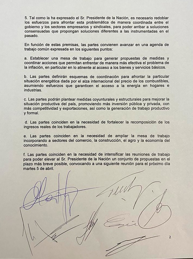 El objetivo del encuentro fue poner en común los puntos de acuerdo entre los sectores sobre la necesidad de afrontar el súbito aumento de precios y sus efectos en el poder adquisitivo de la población, así como del funcionamiento general de la economía, y avanzar en un esquema de futuras reuniones que involucren a más actores para llevar propuestas y soluciones a este problema, según el documento refrendado esta noche por ministros, empresarios y sindicalistas.