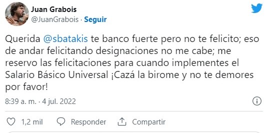 El líder de la Unión de Trabajadores de la Economía Popular (UTEP), Juan Grabois, respaldó a la designada ministra de Economía, Silvina Batakis, aunque le exigió que "cace la birome y no se demore" en implementar el Salario Básico Universal.