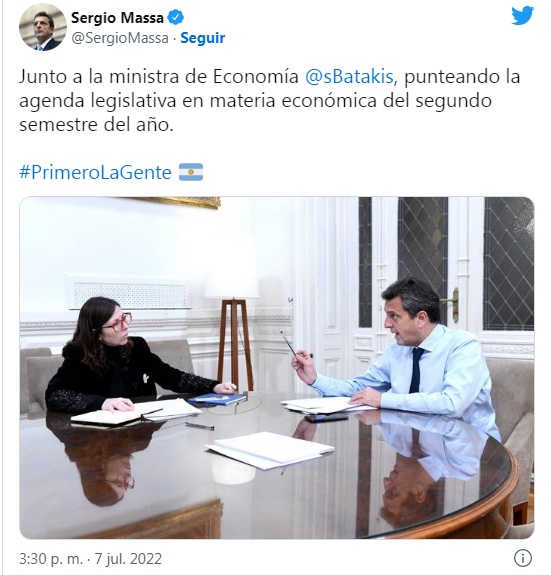 "Junto a la ministra de Economía @sBatakis, punteando la agenda legislativa en materia económica del segundo semestre del año", publicó el titular de la Cámara baja en su cuenta de la red social Twitter.