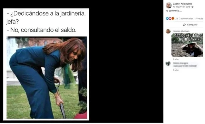 En ese meme, le preguntaban a Cristina si estaba haciendo jardinería y la entonces Presidenta contestaba "Solo consultando el saldo", en relación a las excavaciones en Santa Cruz que había ordenado la Justicia, en búsqueda de dinero enterrado, supuestamente, por corrupción.