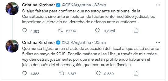 "Si algo faltaba para confirmar que no estoy ante un tribunal de la Constitución, sino ante un pelotón de fusilamiento mediático-judicial, es impedirme el ejercicio del derecho de defensa ante cuestiones", dijo Cristina en su cuenta de Twitter.