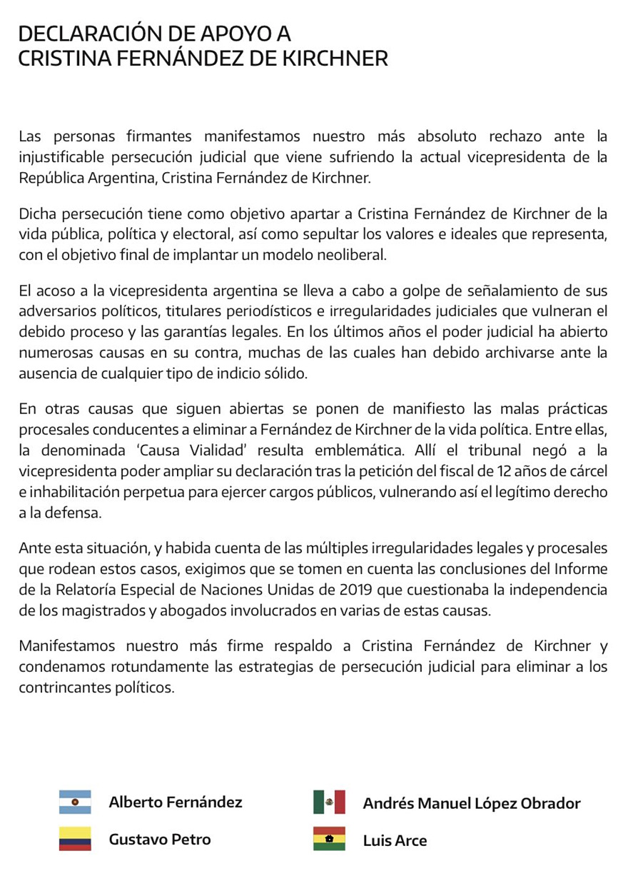 El jefe de Estado acompañó la declaración con el documento rubricado por los cuatro mandatarios: "Las personas firmantes manifestamos nuestro más absoluto rechazo ante la injustificable persecución judicial que viene sufriendo la actual vicepresidenta de la República Argentina, Cristina Fernández de Kirchner", inicia el texto.