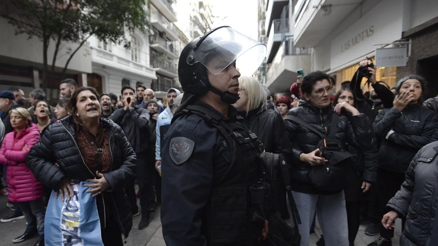 Manifestantes derribaron el sábado el vallado montado por la Policía de la Ciudad en la esquina de Juncal y Uruguay, frente a la residencia de la vicepresidenta, Cristina Kirchner, tras lo cual la fuerza de seguridad reprimió con gases lacrimógenos y carros hidrantes para intentar disuadir.