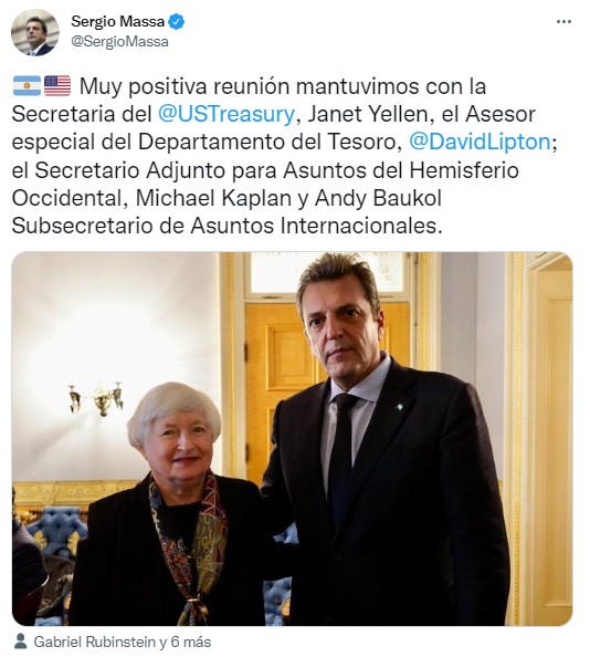 Más temprano, Massa se reunió con la secretaria del Tesoro de los Estados Unidos, Janet Yellen, y su asesor David Lipton, en la sede del organismo. Se trataron ejes para el crecimiento y desarrollo de la Argentina y analizaron el contexto global y los desafíos que representa la guerra para el mundo y para nuestro país en particular.