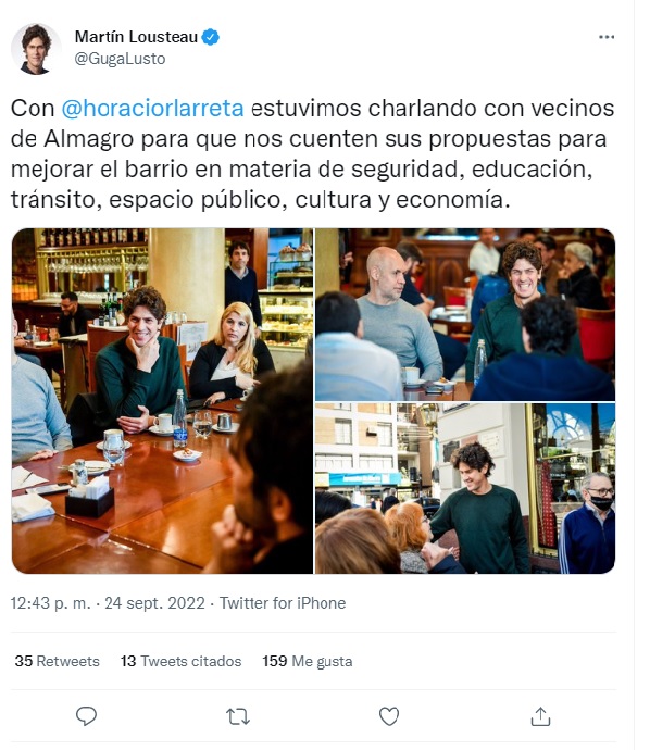 Por su parte, Lousteau expresó: "Gracias a los vecinos y vecinas de Almagro que hoy acercaron sus ideas y preocupaciones para mejorar el barrio y la Ciudad. Con @horaciorlarreta coincidimos en que la escucha es fundamental para el desarrollo del país".