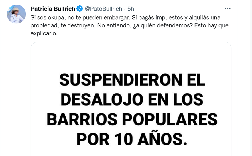 "Si sos okupa, no te pueden embargar. Si pagás impuestos y alquilás una propiedad, te destruyen. No entiendo, ¿a quién defendemos? Esto hay que explicarlo", expresó Bullrich este jueves tras la aprobación del proyecto en la Cámara de Diputados con 227 votos, 39 de ellos pertenecientes al PRO. La frase cayó muy mal en la bancada opositora.