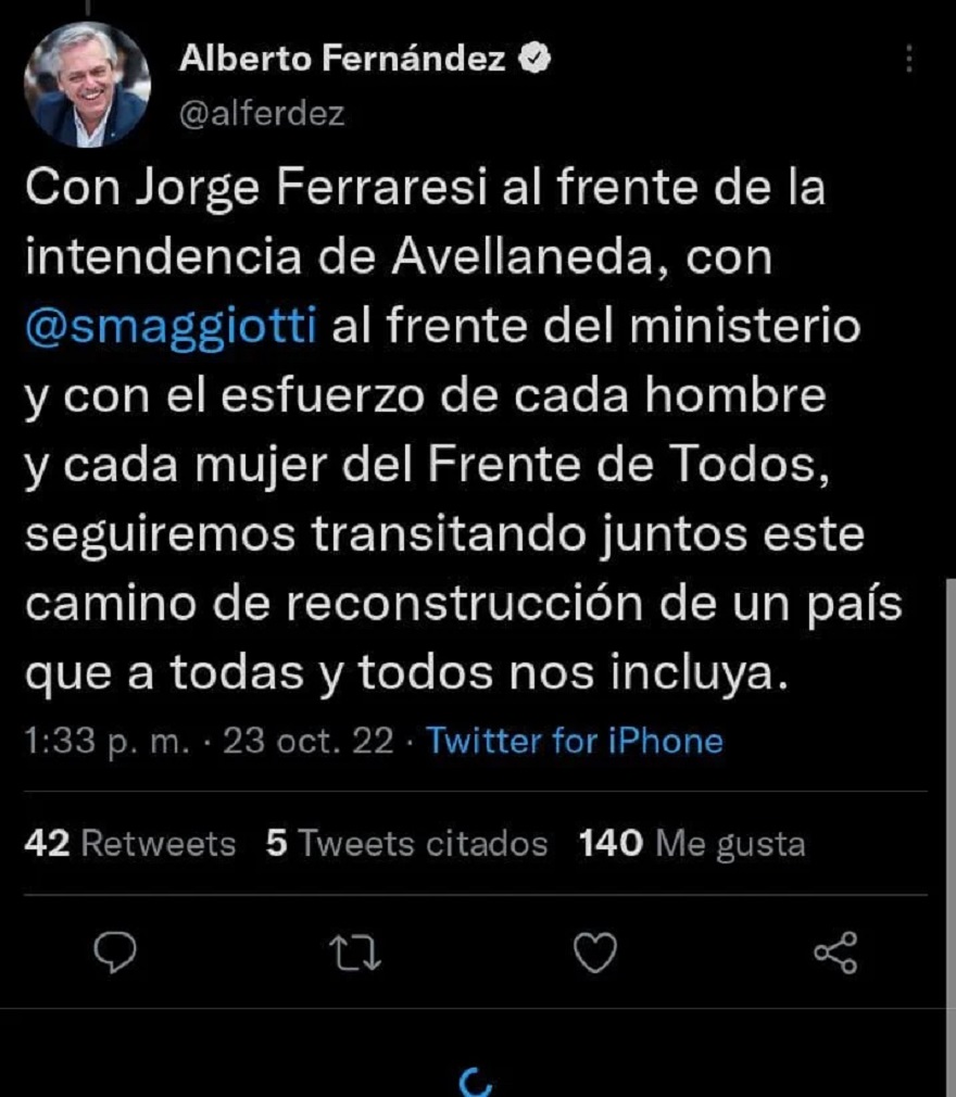 "Ferraresi retornará a su querida Avellaneda el próximo 1 de noviembre para retomar la gestión al frente del municipio", escribió el mandatario, que aprovechó para comunicar la designación de Maggioti como reemplazante del intendente del Gran Buenos Aires