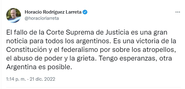 "Es una gran noticia para todos los argentinos. Es una victoria de la Constitución y el federalismo por sobre los atropellos, el abuso de poder y la grieta. Tengo esperanzas, otra Argentina es posible", escribió en su cuenta de Twitter Rodríguez Larreta.
