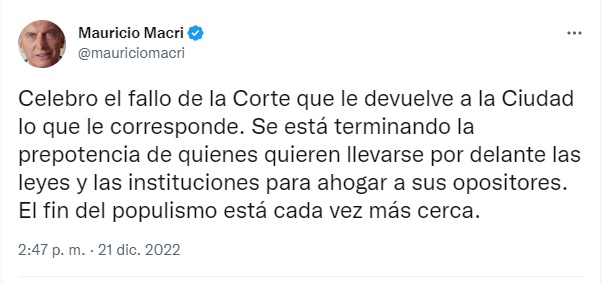Por su parte, el ex presidente Mauricio Macri también festejó con un mensaje en Twitter: "Celebro el fallo de la Corte que le devuelve a la Ciudad lo que le corresponde. Se está terminando la prepotencia de quienes quieren llevarse por delante las leyes y las instituciones para ahogar a sus opositores. El fin del populismo está cada vez más cerca", escribió.